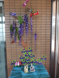 5月の飾り「藤の花、こいのぼり」(デイサービス草柳) 2017年5月5日 / デイサービス 草柳 晃風園デイサービス草柳の5月のイメージは沢山の藤の花とこいのぼりです。 職員が考え、見本を作ったものを、ご利用者様たちが、ひと月かけて熱心に作ってくださいました。 おなじみになった2匹のリスは今月は折り紙の兜をかぶっています。 受付の上には大きな柏餅(これもご利用者様の手作りです)が飾られています。 是非、一度お立ち寄りください。